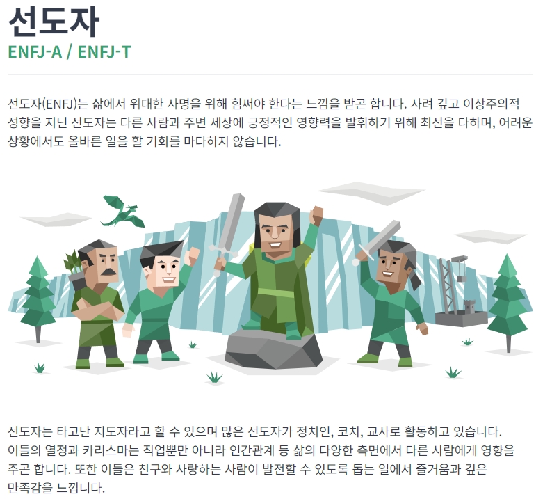 선도자(ENFJ) 유형은 삶의 여러 면에서 리더십을 발휘하며, 특히 정치, 교육, 코칭 분야에서 활약하는 사람들이 많습니다. 이들은 카리스마와 열정으로 주변 사람들에게 긍정적인 영향을 미치며, 어려운 상황에서도 올바른 일을 추구합니다.