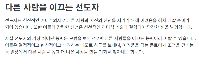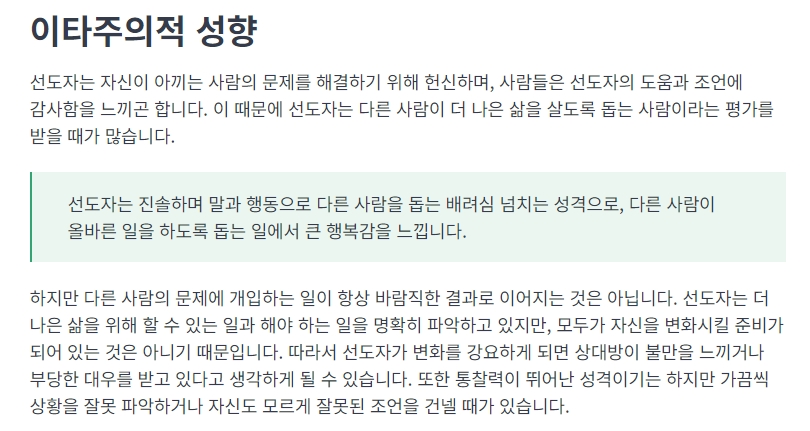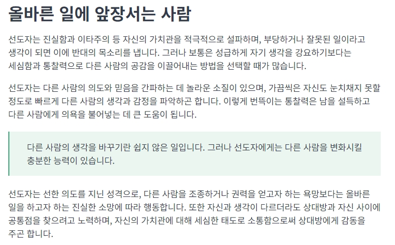 선도자는 자신의 신념을 통해 선한 영향력을 미치고자 하며, 부정적인 상황에도 적극적으로 대처합니다. 이러한 성격은 다른 사람들에게 공감을 이끌어내고 변화를 모색하게 하는 데 큰 도움이 됩니다.