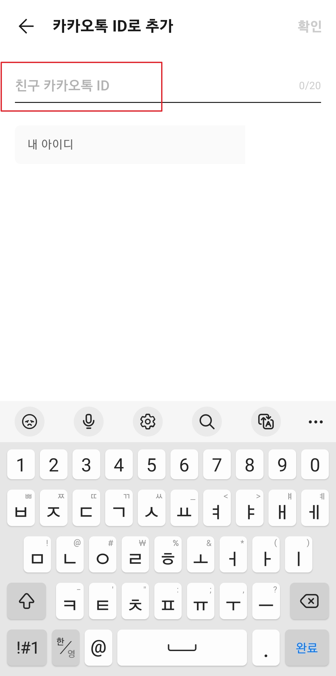이제 검색창에 친구에게 전달받은 카카오톡 아이디를 정확하게 입력할 차례입니다. 아이디는 대소문자를 구분하지 않으니 편하게 입력해도 괜찮습니다. 아이디를 입력하고 나면 키보드의 '찾기' 또는 '확인' 버튼을 눌러 검색을 시작합니다.