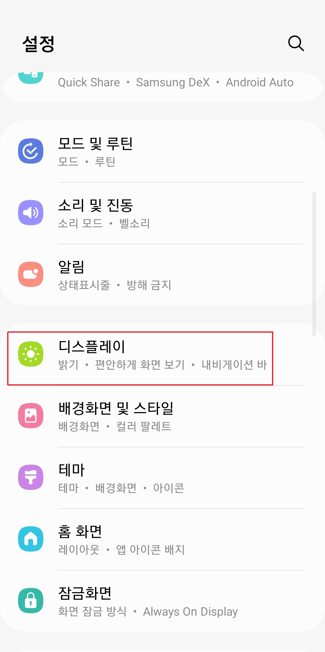 설정 메뉴에 들어오셨다면 다양한 항목들이 목록으로 나타납니다. 화면의 밝기, 편안하게 보기 설정, 글자 크기 등 디스플레이와 관련된 모든 옵션을 변경하기 위해 '디스플레이' 메뉴를 찾아야 합니다.