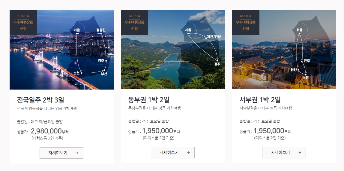 전국일주 2박 3일 코스는 전국 방방곡곡을 다니는 명품 기차여행으로, 출발일은 매주 화요일과 금요일입니다. 상품가는 디럭스룸 2인 기준으로 2,980,000원부터 시작합니다.