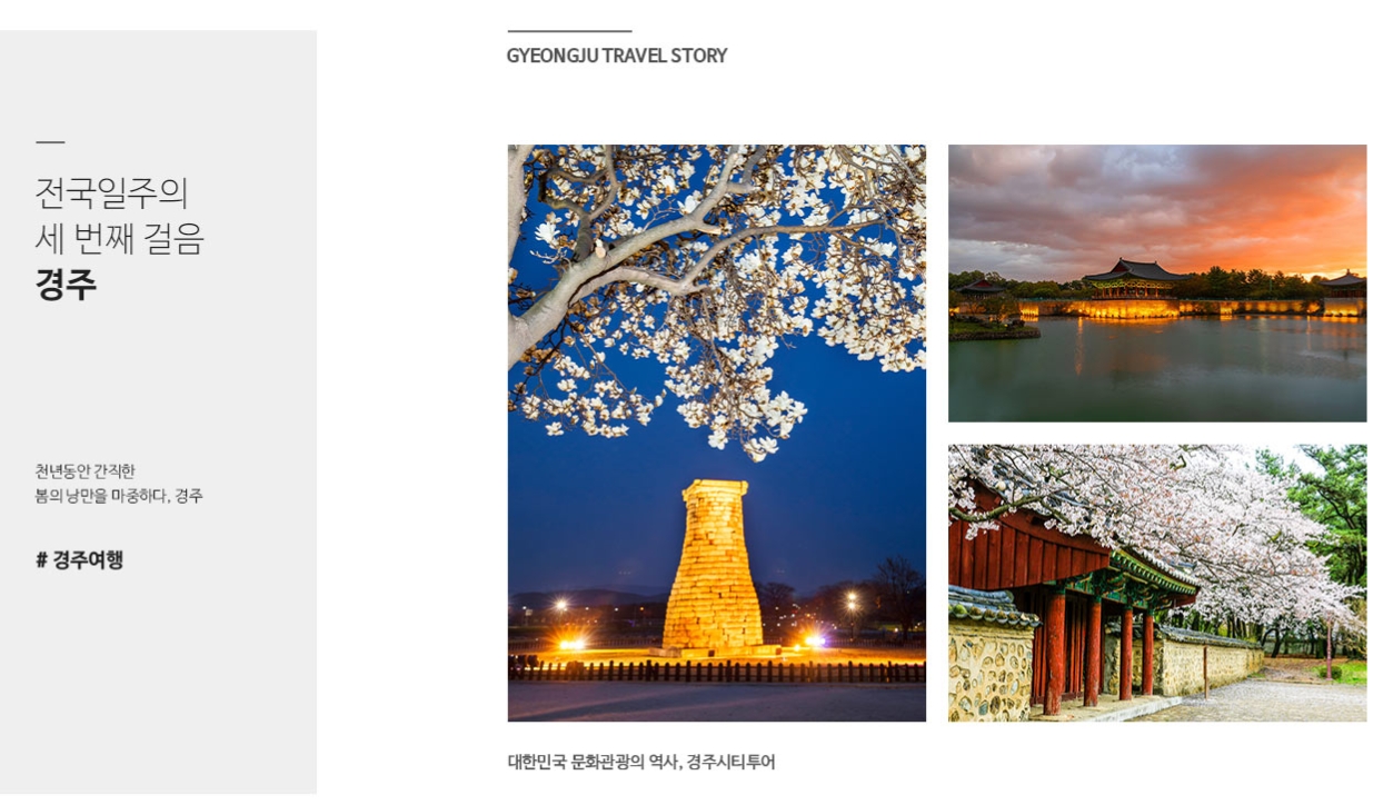 세 번째 사진은 경주를 소개합니다. 경주는 천년동안 간직한 봄의 낭만을 마중하는 역사 도시로, 대표적인 명소인 첨성대와 불국사, 그리고 아름다운 벚꽃길을 감상할 수 있습니다.