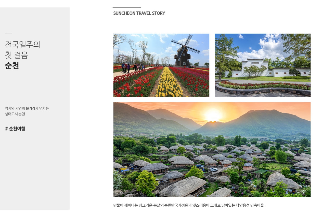전국일주 해랑열차는 다양한 지역을 방문합니다. 첫 번째 사진은 순천을 소개하고 있습니다. 순천은 역사와 자연의 볼거리가 넘치는 생태도시로 유명하며, 만물이 깨어나는 싱그러운 봄날의 순천만국가정원과 옛스러움이 그대로 남아있는 낙안읍성 민속마을을 볼 수 있습니다.