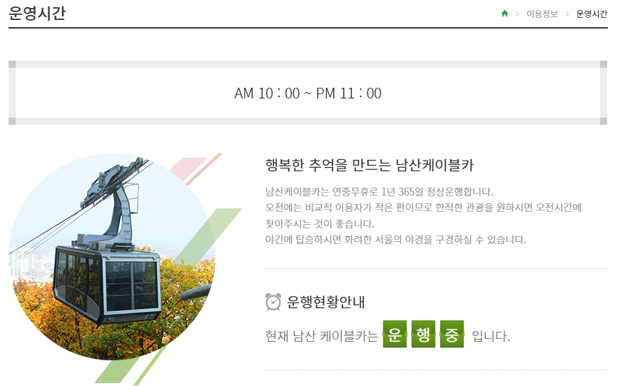 남산 케이블카의 최신 정보를 가장 정확하게 확인하는 방법은 공식 홈페이지를 방문하는 것입니다. 홈페이지 상단 메뉴에서 '이용정보'를 클릭하면 운행 시간부터 요금까지 방문에 필요한 모든 세부 사항을 한눈에 찾아볼 수 있습니다.