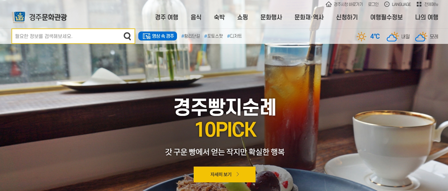경주 문화 관광 웹사이트의 메인 화면에는 지도 정보 말고도 유용한 소식들이 가득합니다. '이달의 추천 여행'처럼 매월 새로운 주제로 여행하기 좋은 곳들을 소개해주기도 하고, 예쁜 야경 명소나 빵집 순례 코스도 알려줍니다.