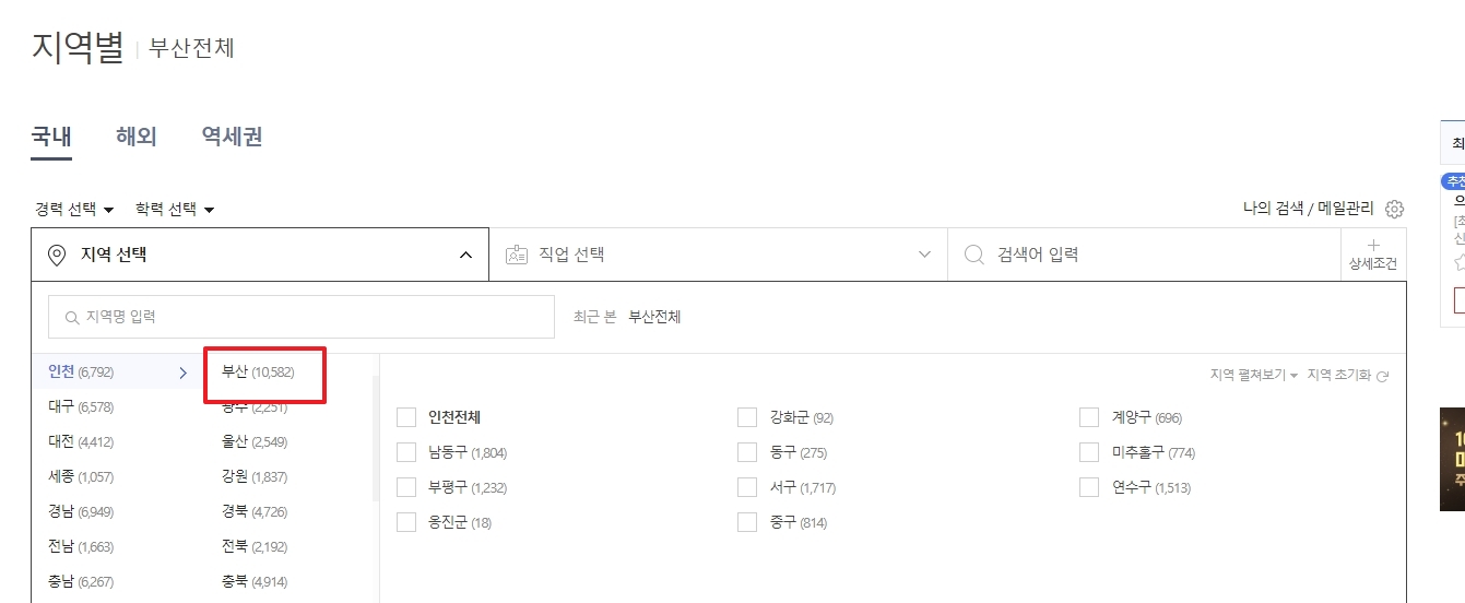 부산 전체로 설정하고 나면 이렇게 채용 공고 리스트가 나와요. 자세히 보시면 '프리미엄', '플래티넘' 이런 식으로 구분이 되어있죠.