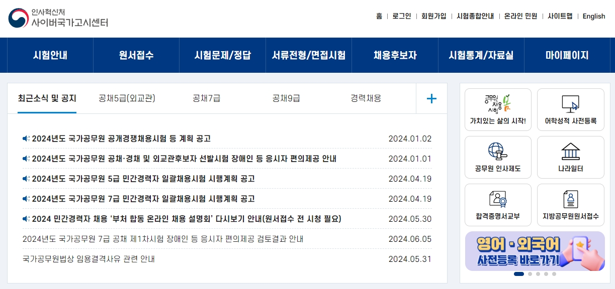 인사혁신처 사이버국가고시센터는 공무원 시험과 관련된 다양한 정보를 제공하는 공식 홈페이지입니다. 이곳에서는 공무원 시험 일정, 외무 고시, 고등 고시, 세무직, 7급, 9급 공무원 채용 등 다양한 시험에 대한 정보와 공채, 특채, 시험 원서접수 및 합격자 발표 안내 등을 확인할 수 있습니다.