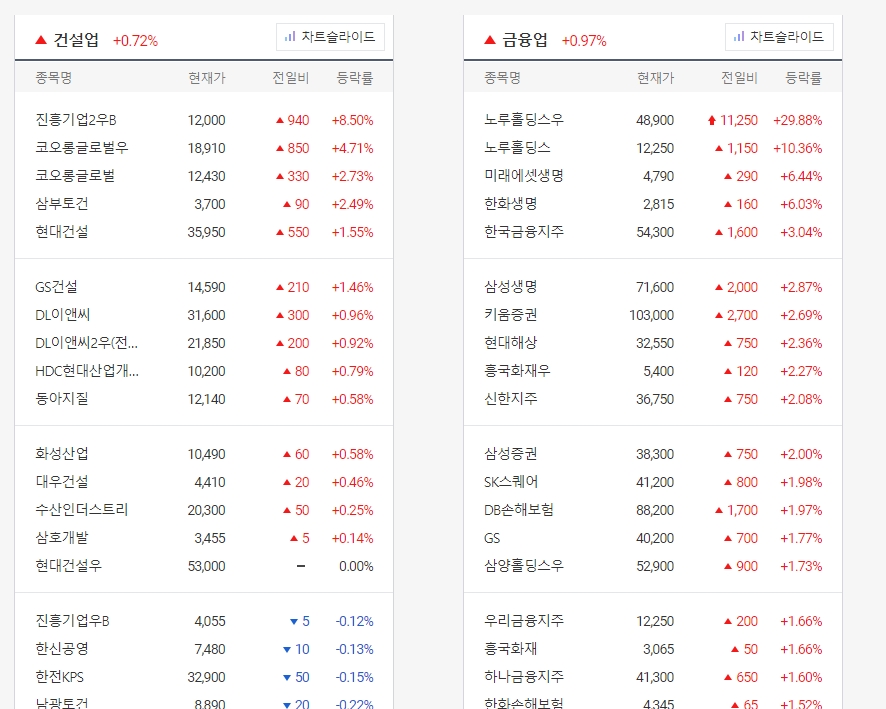 카테고리를 선택하면 단순히 종목명만 나열되는 것이 아니라, 업종별/테마별로 정리된 시세 현황을 볼 수 있습니다. 이렇게 보면 오늘 하루 어떤 산업군이 주도하고 있는지 색깔만 봐도 직관적으로 알 수 있거든요.
