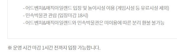 4. 종합이용권으로 어드벤처와 매직아일랜드의 입장 및 놀이시설을 이용할 수 있으며, 민속박물관 관람도 포함됩니다. 다만, 유료 게임 시설은 제외되며, 어드벤처와 매직아일랜드, 민속박물관의 이용 여부에 따른 부분 환불은 불가능합니다. 운영 시간 마감 1시간 전까지 입장이 가능합니다.