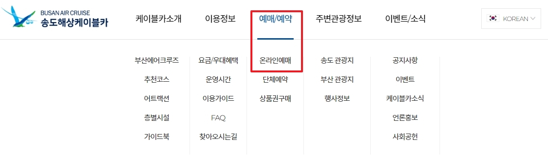 케이블카를 타기 위해 예약을 하려면 홈페이지 상단의 예매/예약 메뉴에서 온라인예매를 선택하면 돼요.