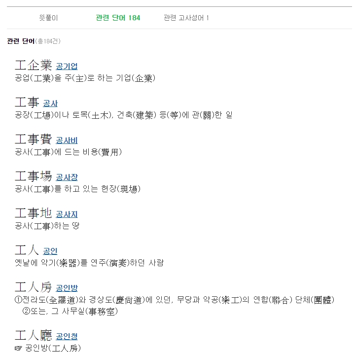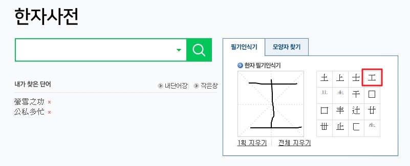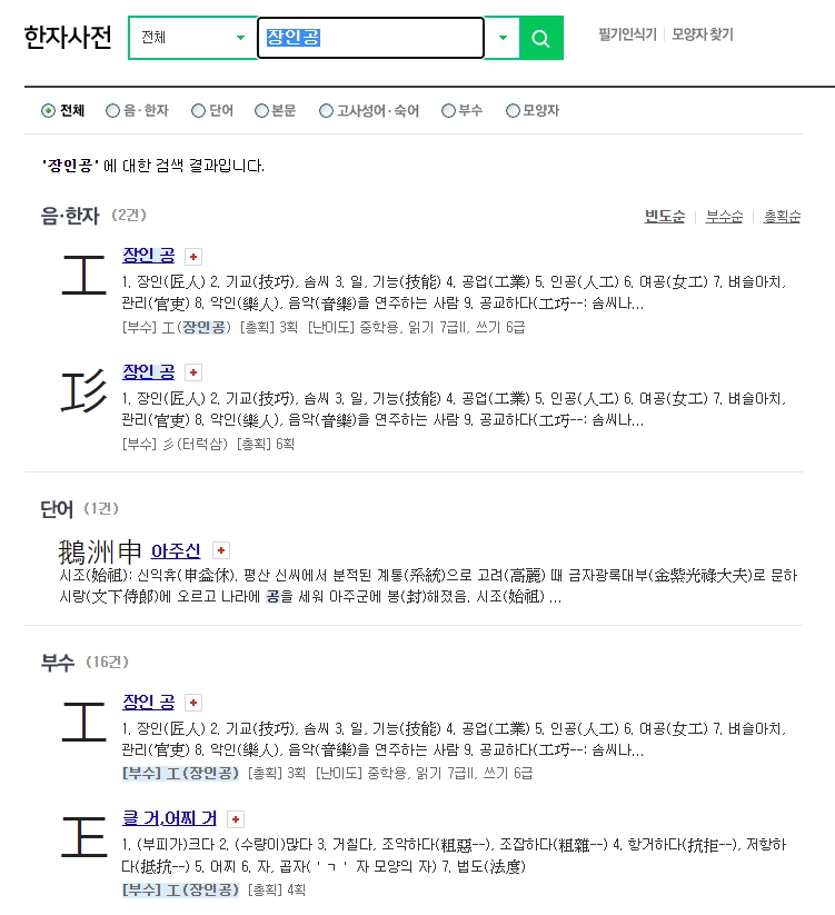 물론 음을 알고 있는 상태라면 굳이 그릴 필요 없이 바로 검색창에 한글을 입력하시면 돼요. 예를 들어 '장인 공'자를 찾고 싶다면 검색어에 입력 후 엔터를 치면 되는데, 이때 해당 글자뿐만 아니라 그 글자가 부수로 들어간 다양한 파생 한자들까지 한 번에 확인할 수 있어 편리합니다.