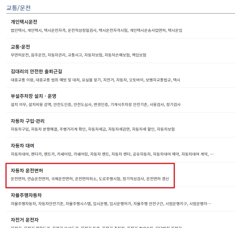 그다음 하단에 나오는 세부 메뉴에서 '자동차 운전면허'를 클릭하시면 면허 취득부터 갱신, 재발급까지 모든 과정을 상세하게 볼 수 있습니다.
