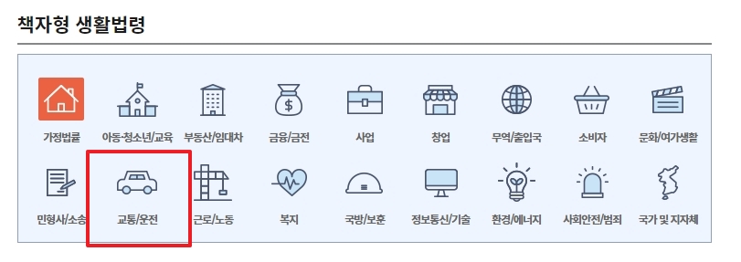 다양한 아이콘 중에서 자동차 모양의 '교통/운전' 아이콘을 선택해 주세요. 운전면허뿐만 아니라 과태료나 범칙금 관련된 내용도 여기서 다 확인할 수 있거든요.