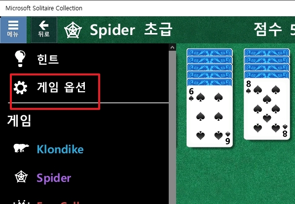 6. 메뉴에서 게임 옵션을 클릭합니다. 여기서 슈트 수를 설정하거나 레이아웃 방향, 소리 크기, 난이도 설정 등을 할 수 있습니다. 모든 난이도가 처음부터 개방되어 있는 것은 아니며, 일정 이상 클리어해야 개방되는 난이도도 있습니다.