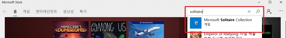 2. Microsoft Store가 실행되면, 우측 상단의 검색 버튼을 클릭하고 Solitaire를 검색하여 다운로드 받습니다.
