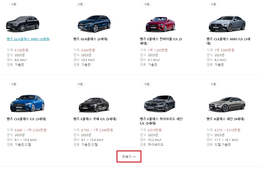 화면을 계속 내리다 보면 리스트가 끝이 안 보이고 급기야 '더보기' 버튼까지 눌러야 하는 상황이 오는데요. 사실 이렇게 무작정 스크롤만 내려서는 내가 원하는 C클래스E클래스를 찾다가 지칠 수도 있어요.