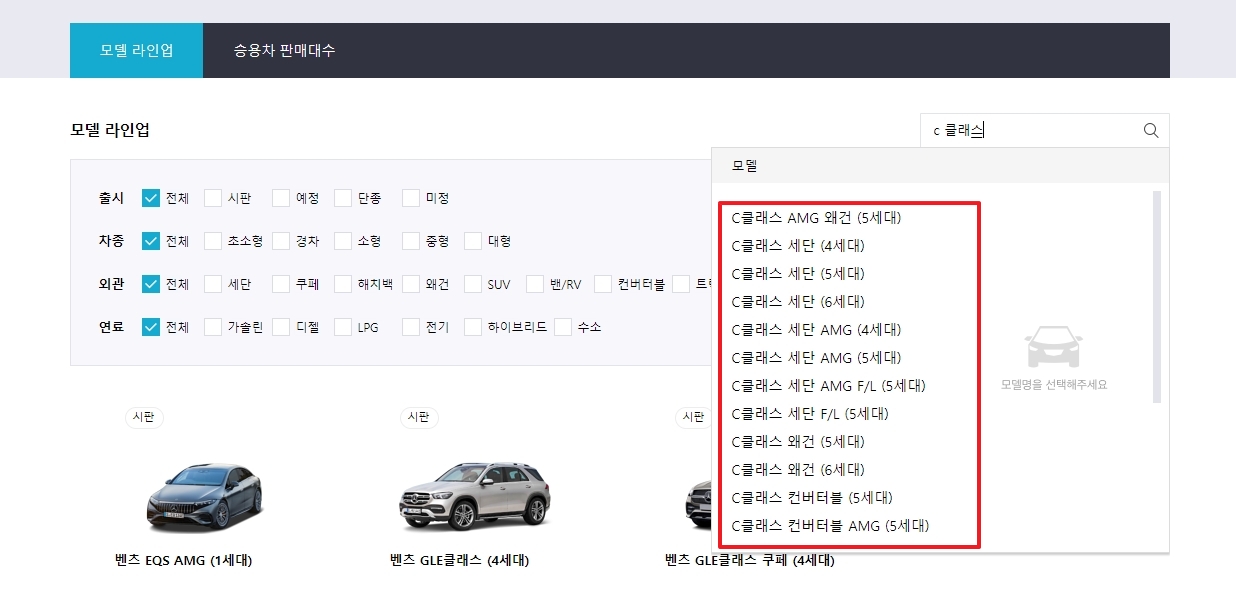 여기에 찾고 싶은 모델명(예: C클래스)을 직접 입력하면 되는데요. 포털 전체 검색이 아니라 이 페이지 내에 있는 DB에서 검색하는 기능이라 아주 빠르고 정확하게 원하는 차종만 딱 골라준답니다.