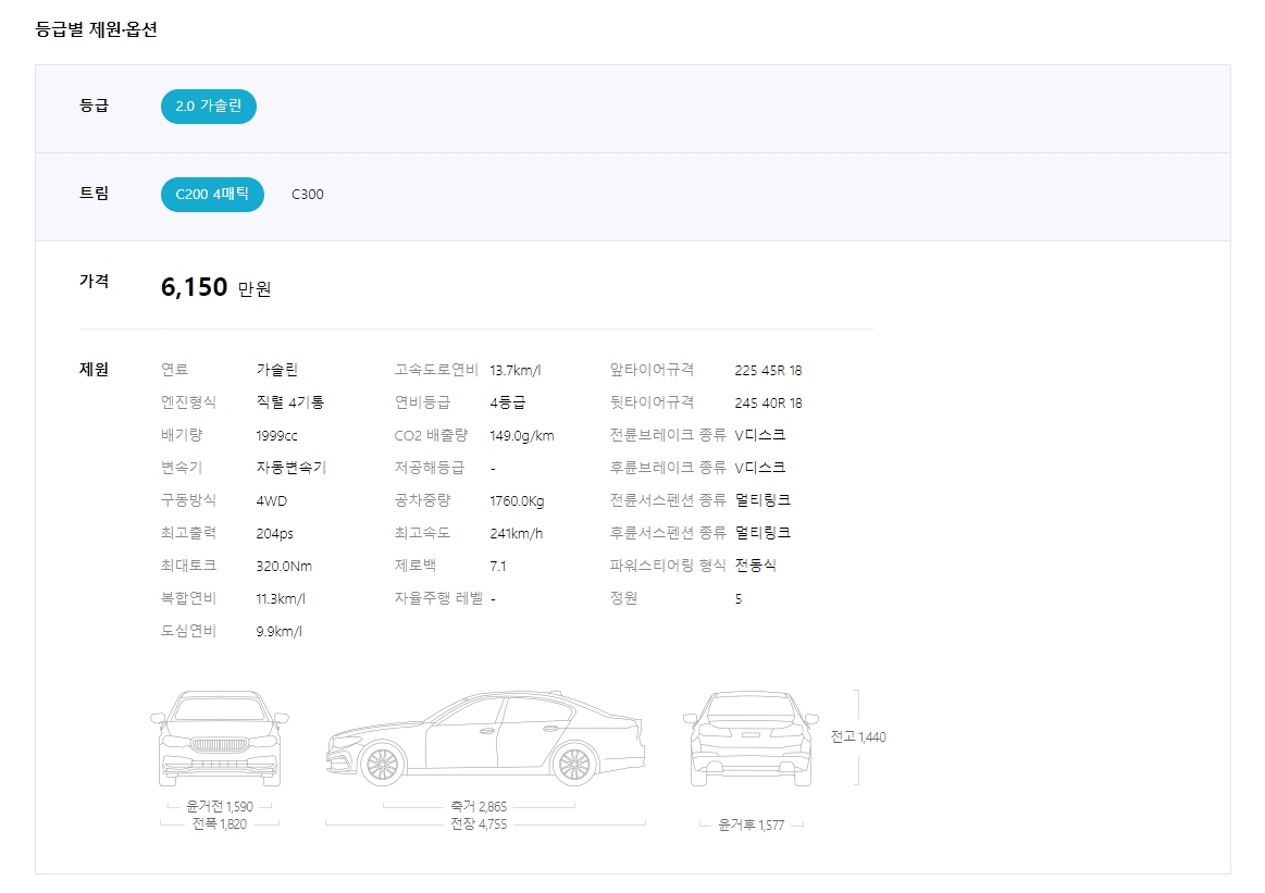 차량의 외관 디자인도 크게 볼 수 있고, 전체적인 출시가 범위가 나오는데요. 하지만 여기서 끝이 아니죠. 같은 C클래스라도 트림에 따라 가격이 천차만별이니 스크롤을 더 내려서 세부 내용을 확인해야 해요.