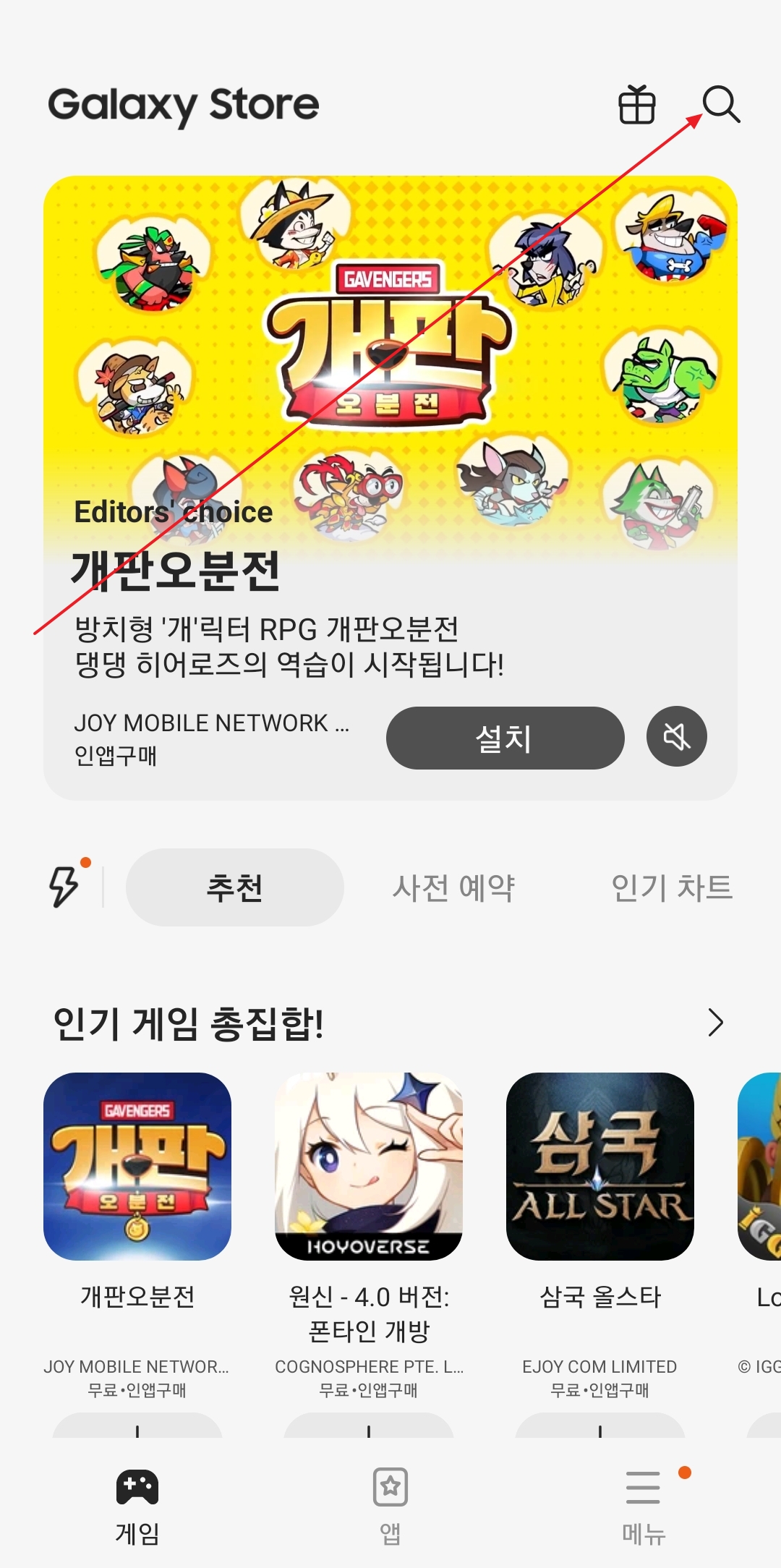 2. Galaxy Store가 열리면, 화면 우측 상단에 돋보기 모양의 검색 버튼이 있습니다. 이 버튼을 터치한 다음, 검색창에 Good Lock을 입력합니다. 검색을 눌러 결과를 확인합니다. 여기서 luck으로 잘못 입력하지 않도록 주의하세요.