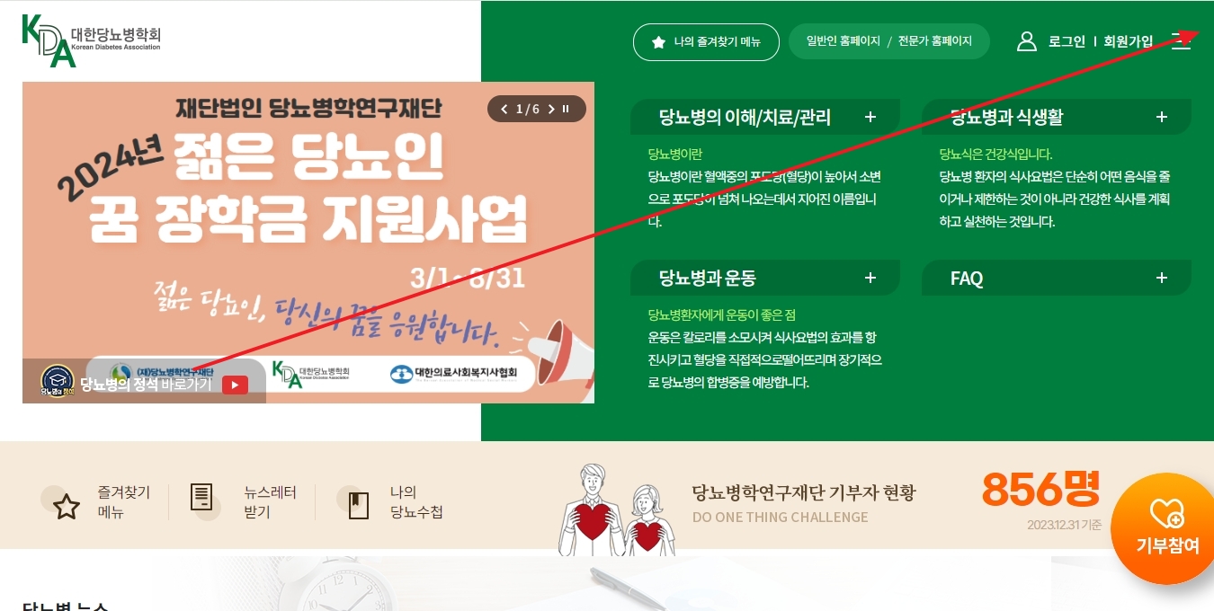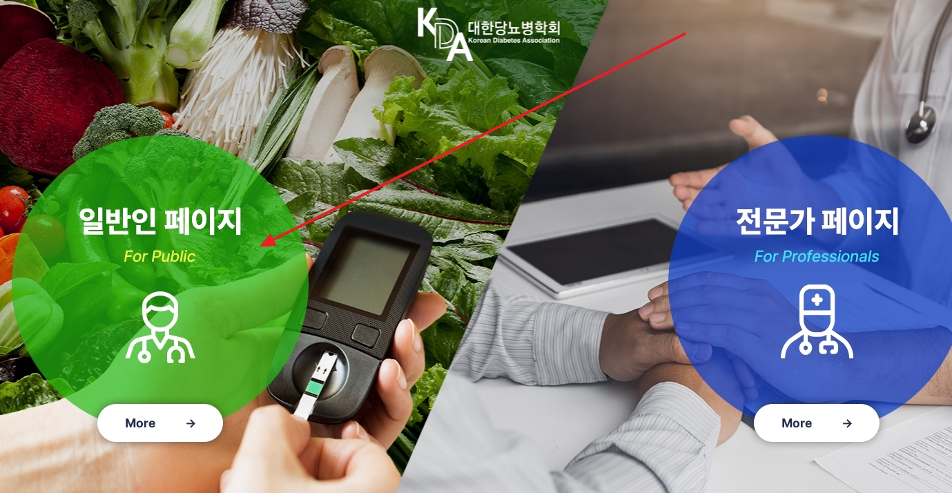 1. 대한당뇨병학회 홈페이지로 들어갑니다. 이곳에서는 당뇨병 클리닉, 인터넷강좌, 당뇨 상식 등을 제공합니다.