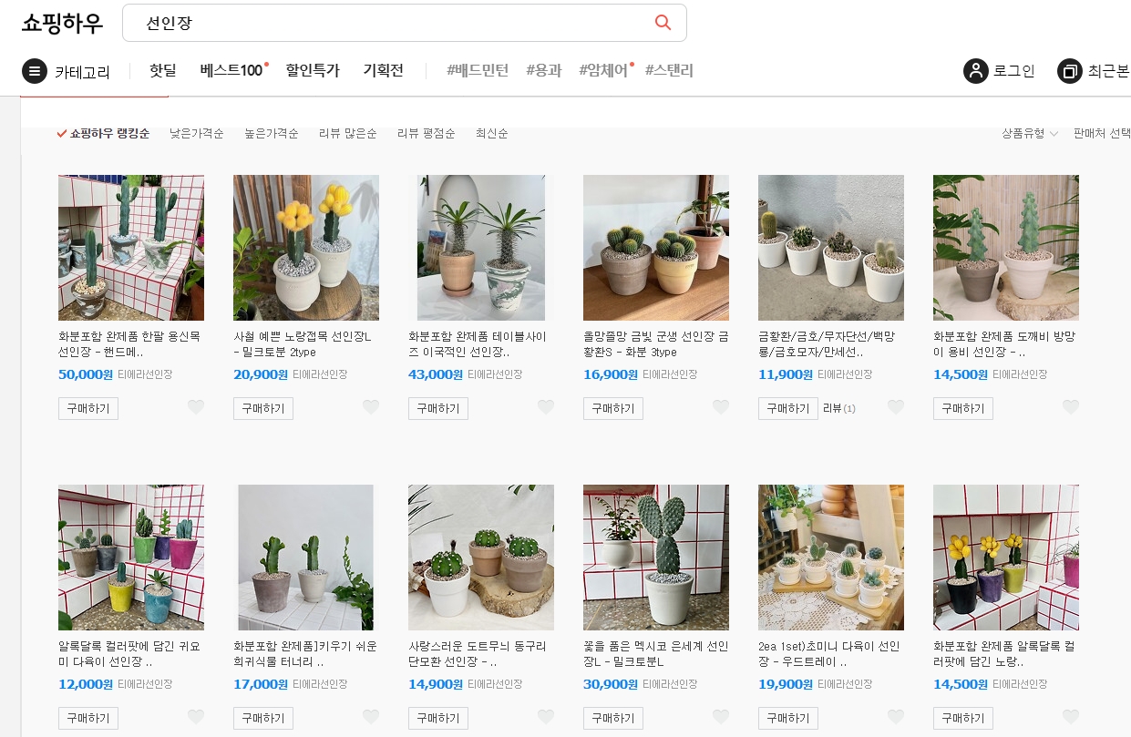 쇼핑몰에서 선인장을 검색하니 다양한 종류와 크기의 선인장들이 판매되고 있었습니다. 여러분도 마음에 드는 선인장을 골라서 구매하면 집에서 직접 키워볼 수 있겠죠. 이렇게 구매를 해야만 우리 집에서 선인장을 가꾸며 기쁨을 느낄 수 있을 테니까요.
