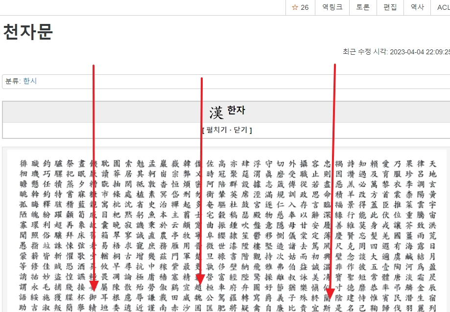 2. 나무위키에서 천자문을 검색하고 스크롤을 내리면 천자문의 전문을 볼 수 있습니다. 각 한자의 독음과 기본적인 해석이 포함되어 있어 학습에 바로 활용할 수 있습니다. 한자 한 개 한 개에 대한 상세한 설명은 없지만, 웹에서 직접 보며 학습하는 것이 현대적인 방식에 더 부합합니다.