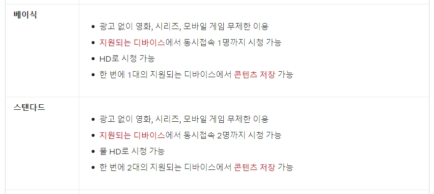 3. 베이식 요금제는 광고 없이 모든 영화와 시리즈, 모바일 게임을 무제한으로 볼 수 있어요. 이 요금제는 HD 화질로 제공되며, 한 번에 1명이 시청할 수 있어요. 또한, 한 디바이스에만 콘텐츠를 저장할 수 있어요. 스탠다드 요금제는 베이식과 달리 동시에 2명이 시청할 수 있고, 풀 HD 화질로 제공돼요. 한 번에 2대의 디바이스에 콘텐츠 저장도 가능해요.