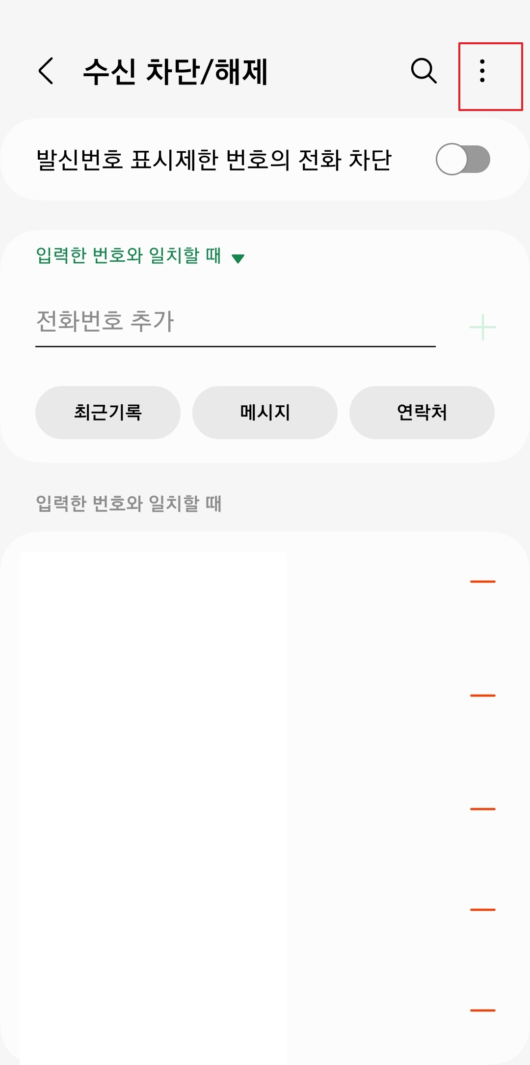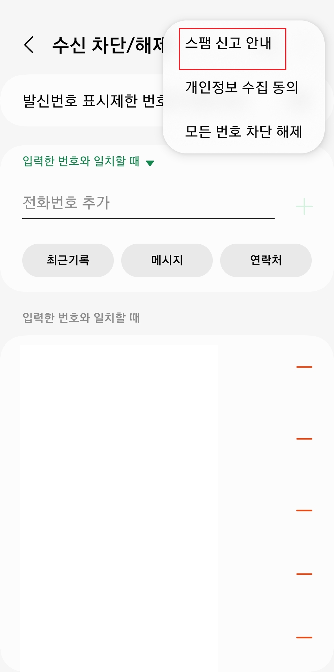 4. 그 화면에서는 차단하고 싶은 번호를 입력할 수 있는 입력란과 차단을 활성화하는 + 버튼이 있어요. 차단할 번호를 입력하고 + 버튼을 누르면, 해당 번호가 차단돼요. 이때 상단에 있는 초록색 옵션 부분도 체크하는 것이 중요해요.