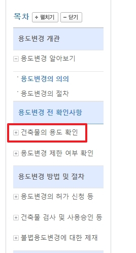 4. 새롭게 로딩된 페이지에서는 좌측 목차를 통해 건축물의 용도 확인 항목을 클릭하세요. 이어서 건축물 용도 등의 확인을 클릭하여 상세 내용을 접근할 수 있습니다. 이렇게 하면 건축물의 용도와 관련된 상세 정보를 얻을 수 있습니다.