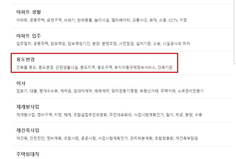 3. 다양한 주제들 중에서 부동산 임대차를 선택하세요. 그 후, 용도변경 메뉴를 찾아 클릭하면 관련 정보와 페이지로 이동할 수 있습니다. 이 메뉴를 통해 부동산 관련 법령 정보를 자세히 확인할 수 있습니다.