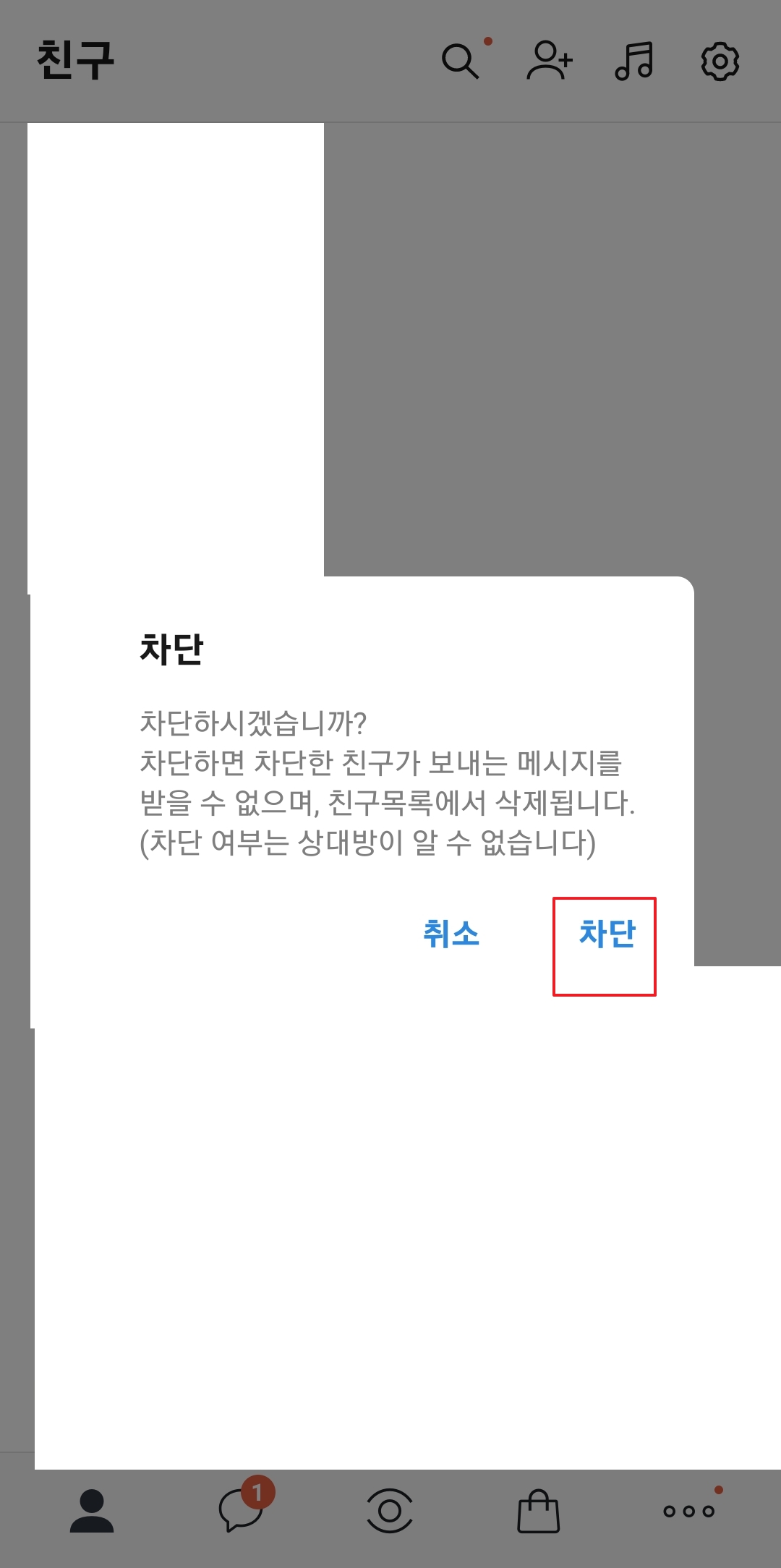 2. 차단을 선택하면 새로운 창이 열립니다. 여기서 메시지를 차단할지, 프로필을 비공개로 설정할지를 선택할 수 있습니다. 먼저 메시지 차단을 선택하고, 확인을 위해 다시 한 번 차단 버튼을 눌러주세요.