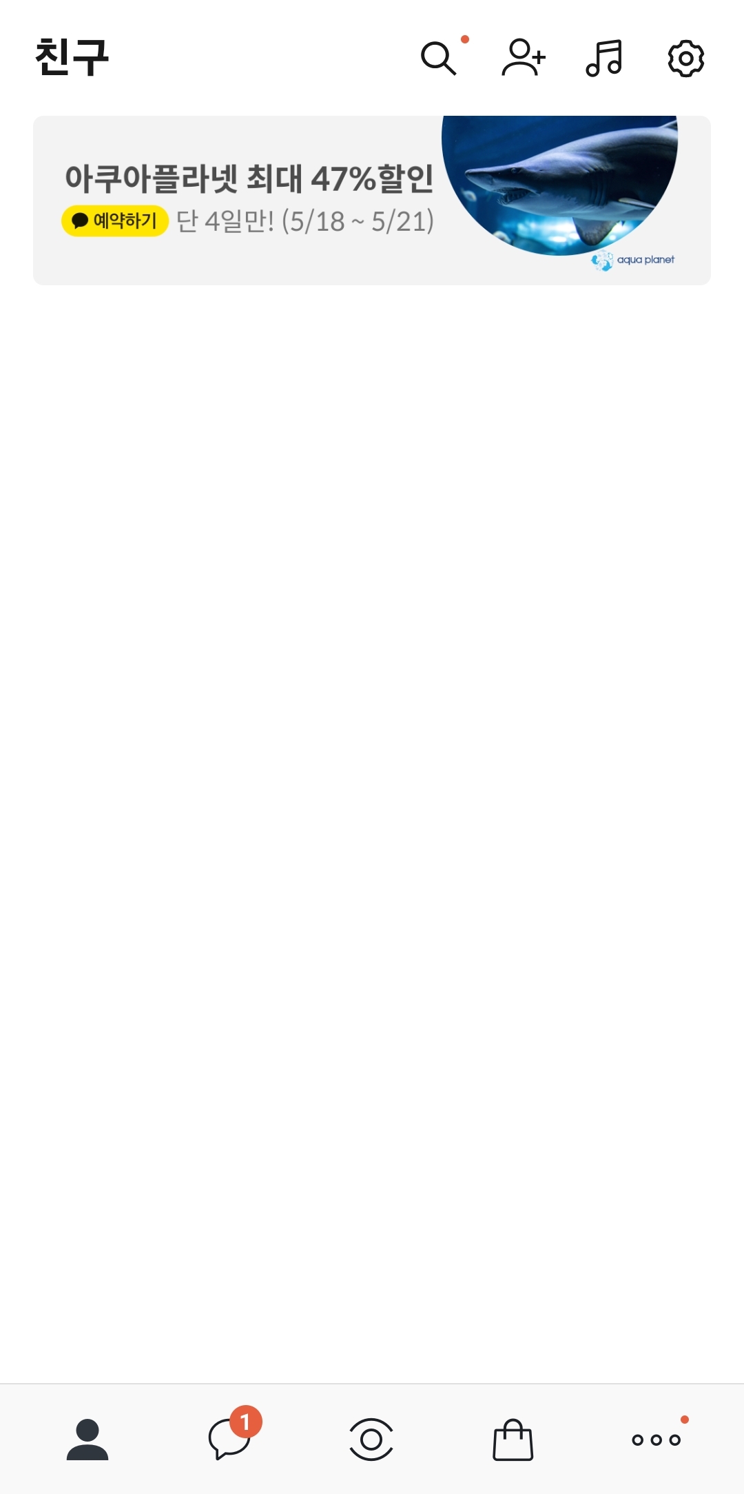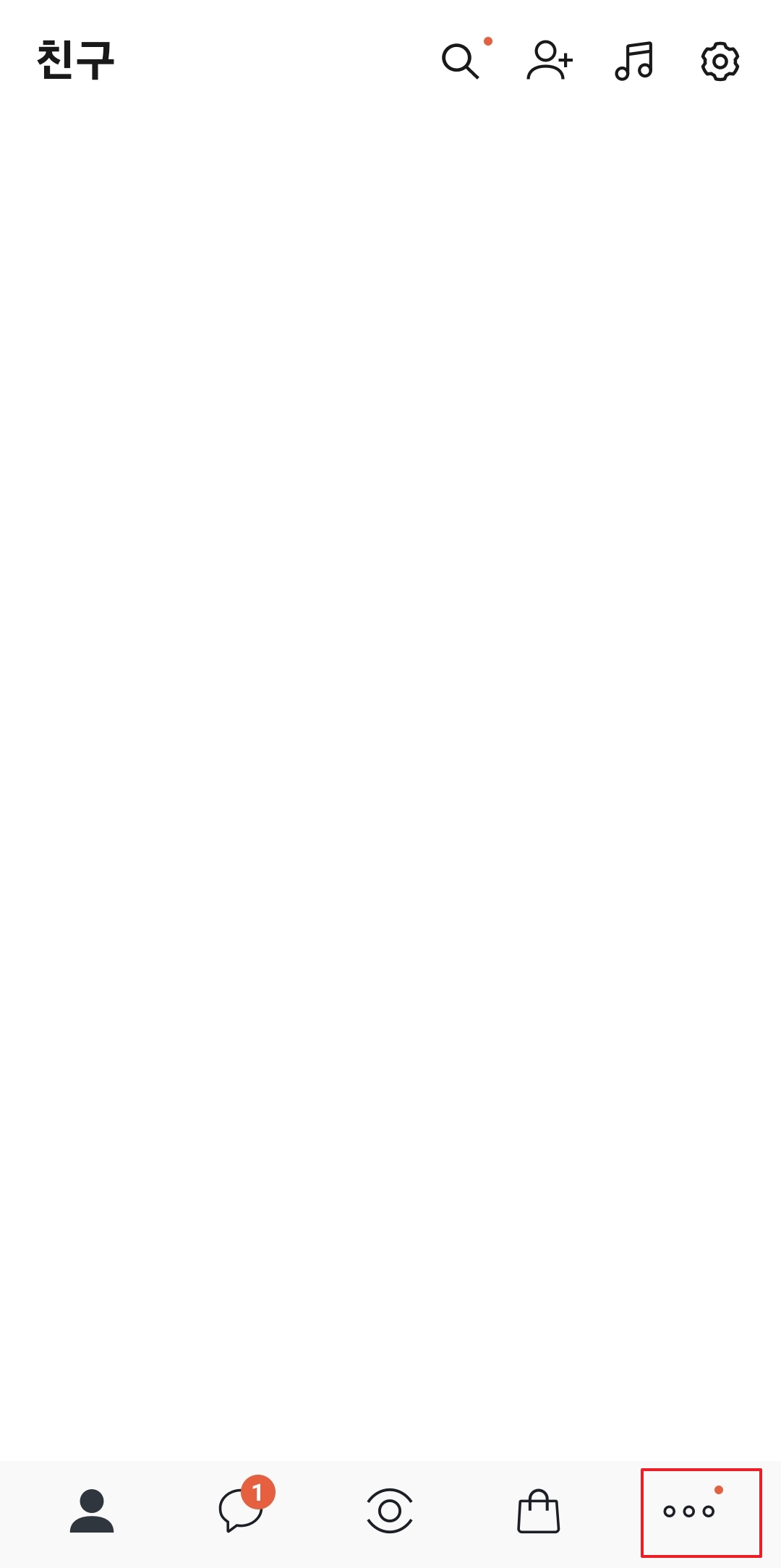 3. 차단이 완료되면 카카오톡 메인 화면으로 돌아갑니다. 화면 우측 하단에 있는 점 세 개가 있는 메뉴 버튼을 클릭하세요. 그러면 더보기 메뉴로 이동하게 됩니다. 더보기 메뉴에서 오른쪽 상단에 있는 톱니바퀴 모양의 설정 아이콘을 클릭하여 설정 메뉴로 들어갑니다.