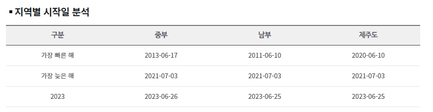 9. 중부지방의 장마 종료일은 가장 빠른 해가 2018년 7월 11일, 가장 늦은 해는 2020년 8월 16일입니다. 남부지방은 가장 빠른 해가 2018년 7월 9일, 가장 늦은 해는 2013년 8월 2일입니다. 제주도는 가장 빠른 해가 2018년 7월 9일, 가장 늦은 해는 2020년 7월 28일입니다. 2023년의 경우, 중부와 남부지방은 7월 26일, 제주도는 7월 25일에 장마가 종료되었습니다.