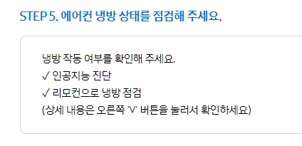 8. 에어컨 냉방 상태를 점검하는 방법도 나와 있습니다. 에어컨이 제대로 냉방 작동을 하는지 확인해야 합니다. 인공지능 진단 기능을 사용하거나, 리모컨을 이용해 냉방 상태를 점검할 수 있습니다. 자세한 내용은 오른쪽 ∨ 버튼을 눌러 확인할 수 있습니다.