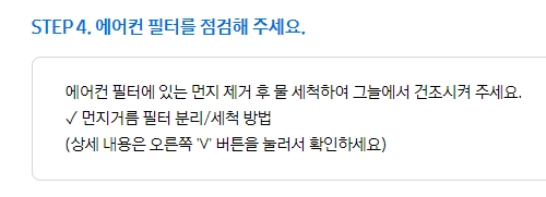 7. 에어컨 필터를 점검하는 방법도 안내되어 있습니다. 에어컨 필터에 쌓인 먼지를 제거한 후 물로 세척하고, 그늘에서 완전히 건조시켜야 합니다. 먼지거름 필터 분리 및 세척 방법에 대한 자세한 내용은 오른쪽 ∨ 버튼을 눌러 확인할 수 있습니다.