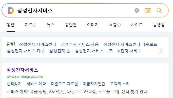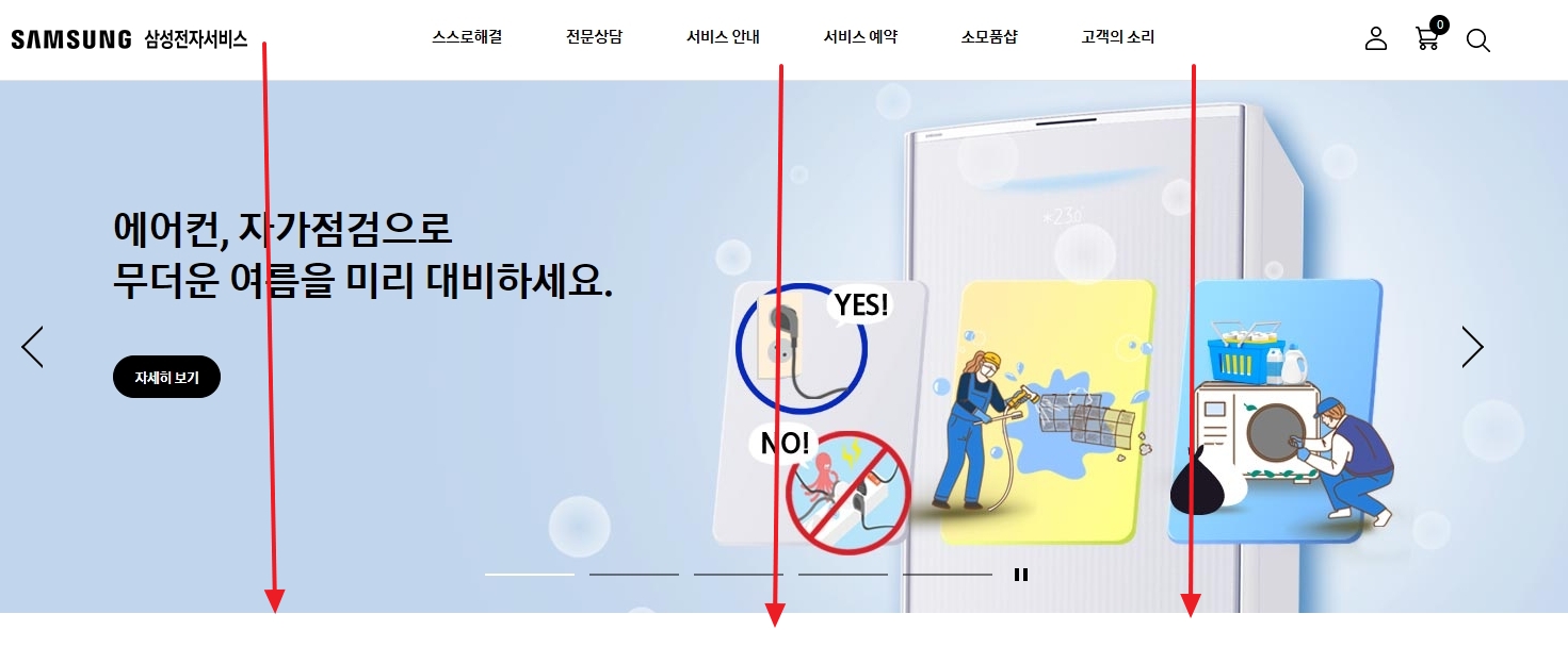 1. 삼성전자서비스 홈페이지로 들어갑니다. 이곳에서는 서비스 예약, 제품 상담, 자가진단, 다운로드 자료실, 소모품 구매, 센터 찾기 안내 등의 다양한 서비스를 제공합니다.