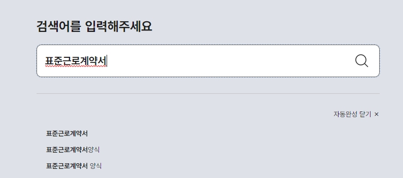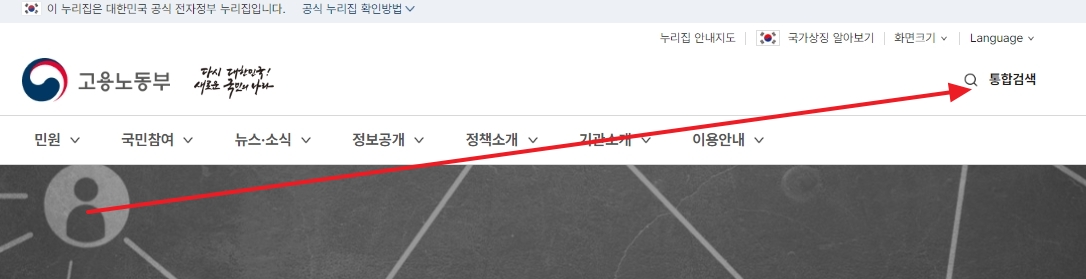 2. 홈페이지에 들어가면 우측 상단에 통합검색 버튼이 있습니다. 이 버튼을 클릭하여 검색창을 엽니다. 그곳에 표준근로계약서를 입력하고 검색을 시작합니다.