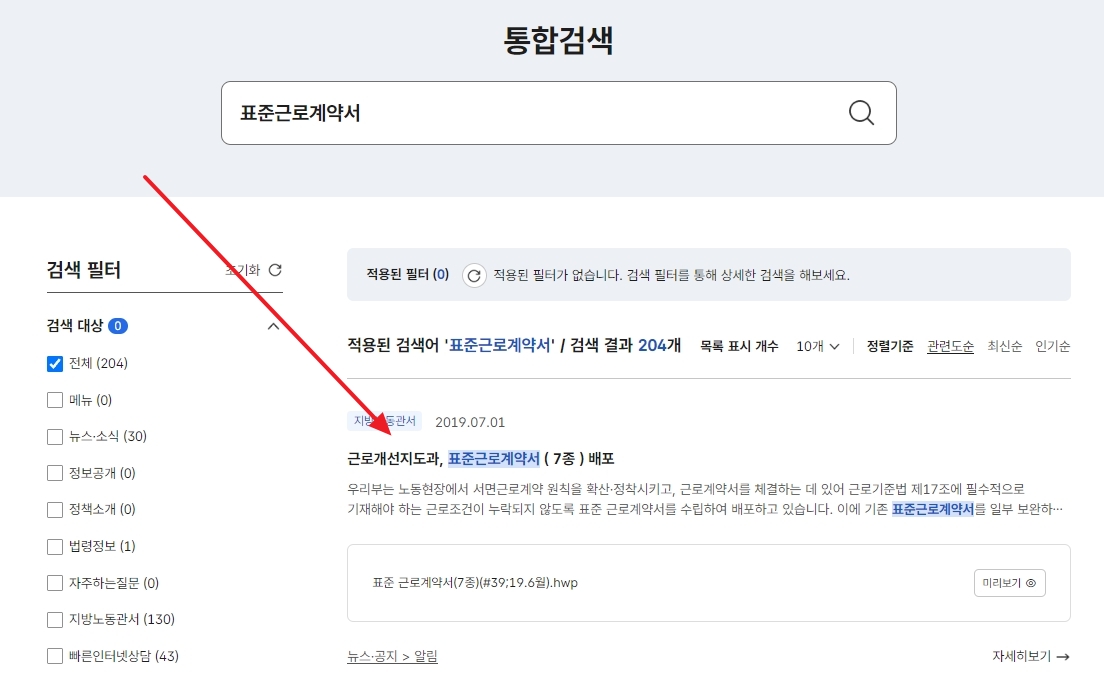 3. 검색 결과 중 근로개선지도과 표준근로계약서 7종 배포라는 제목의 항목을 찾습니다. 이 항목을 클릭하면 관련 페이지로 이동하게 되는데, 여기서 첨부파일을 다운로드할 수 있습니다.