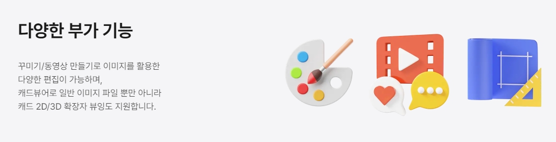 6. 알씨는 다양한 부가 기능을 제공합니다. 꾸미기 도구나 동영상 만들기로 이미지를 활용한 다양한 편집이 가능합니다. 일반 이미지 파일뿐만 아니라 캐드 2D/3D 확장자 뷰잉도 지원합니다.