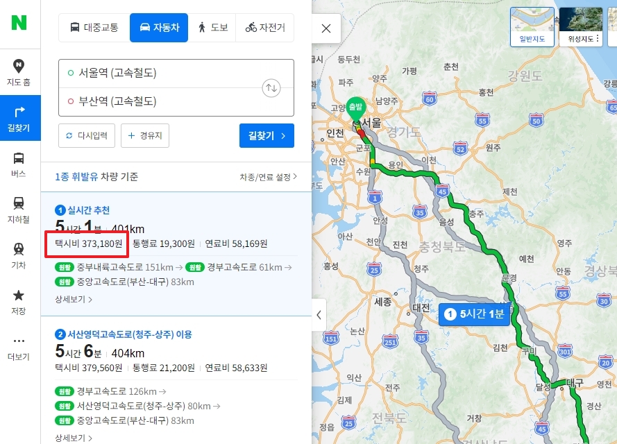 4. 서울에서 부산까지 기차역을 기준으로 자동차로 이동하면 약 5시간이 소요되고, 택시비는 약 37만원 정도 나옵니다. 예전에 서울에서 부산까지 18~20만원에 협상하고 갈 수 있었는데, 미터기로 37만원이 찍히니까 요즘 시세로는 30만원 정도가 되지 않을까 생각이 드네요. 아니면 오히려 거리가 약 400km인데다가 돌아올 때 빈차로 와야 하므로 사실상 800km에 해당하는 요금과 10시간의 시간을 계산해야 하니 미터기보다 더 받을지도 모르겠습니다.