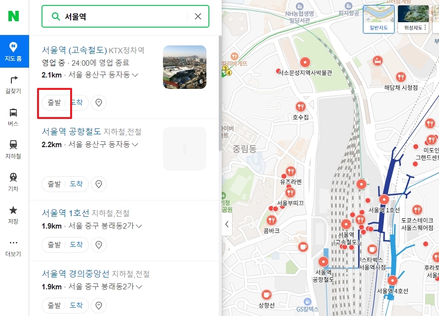 2. 먼저 출발지를 설정해야 합니다. 저는 서울역을 출발지로 설정했습니다. 검색창에 서울역을 입력하고 출발지로 선택하면 됩니다.
