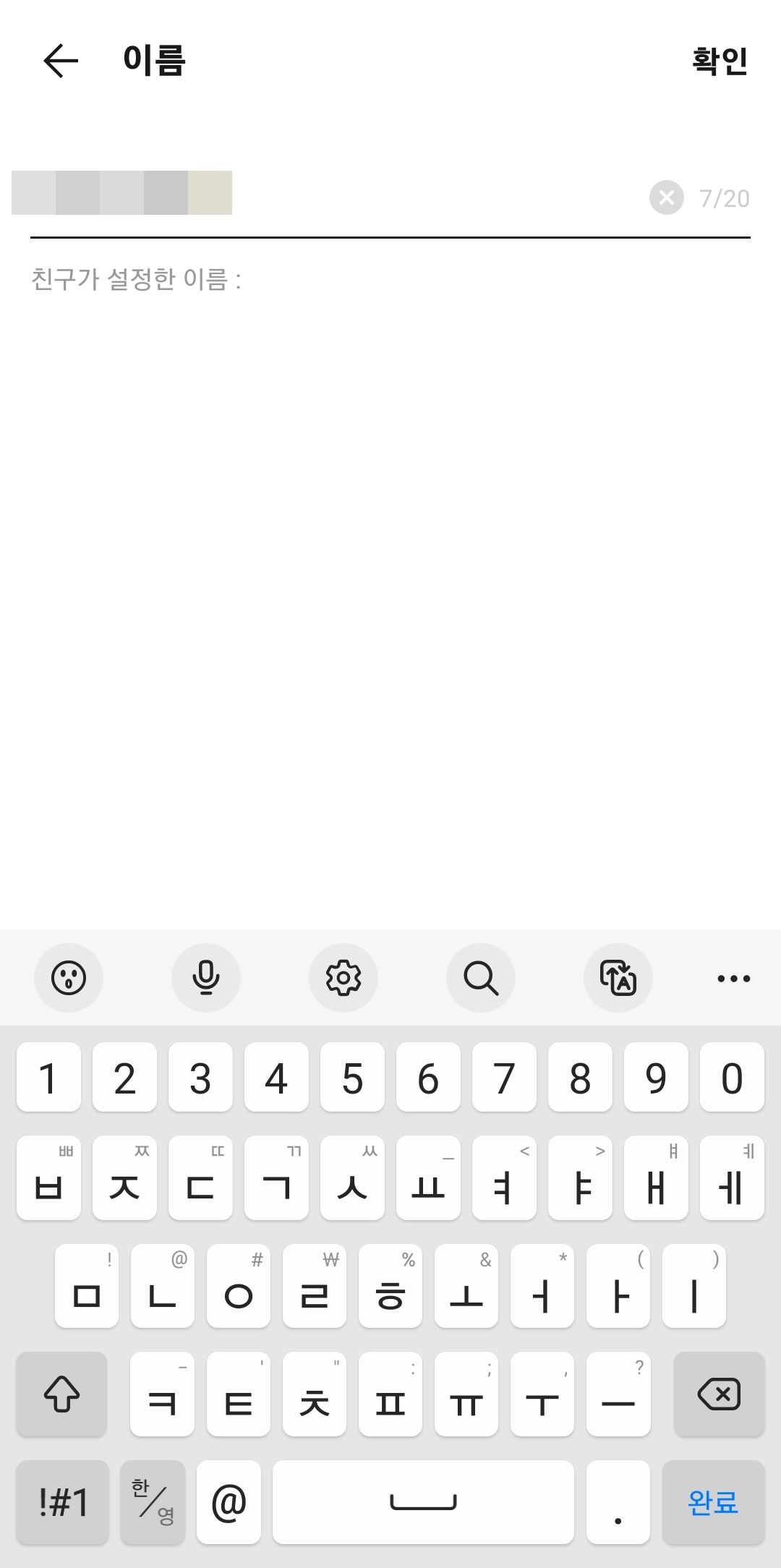새로운 이름을 입력하는 과정은 매우 간단합니다. 상단의 입력란에 원하는 새로운 이름을 입력하면 됩니다. 예를 들어, 친구의 이름을 철수에서 친구1로 바꾸고 싶다면, 입력란에 친구1을 입력하면 됩니다. 이름을 변경한 후, 화면 하단에 있는 확인 버튼을 눌러야 변경 사항이 저장됩니다. 이 과정을 완료하면 친구 목록에서 해당 친구의 이름이 새로 입력한 이름으로 변경됩니다.