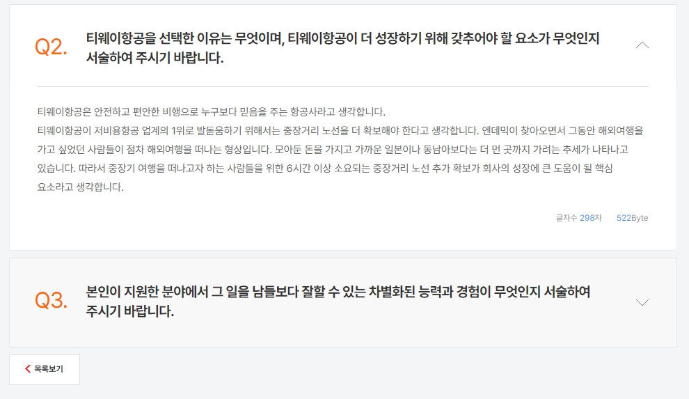 8. 잡코리아에는 티웨이 항공을 비롯한 다양한 직군의 자기소개서 예시도 있습니다. 글자수가 500byte로 제한된 경우가 많아, 간략하게 요약해서 담는 능력도 필요합니다. 제한된 글자수 안에서 효과적으로 내용을 전달하는 것이 중요합니다.