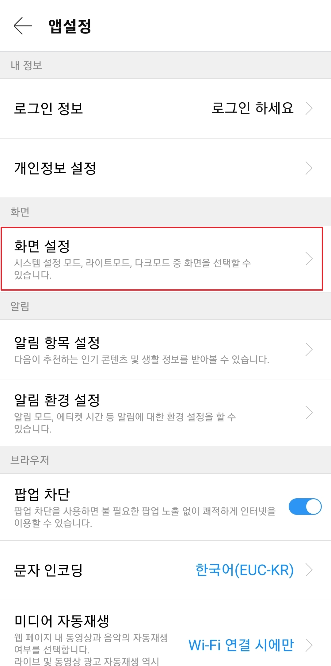 4. 앱 설정 창으로 이동하면 화면 - 화면 설정 메뉴를 클릭하고 여기서 다크모드를 선택합니다.