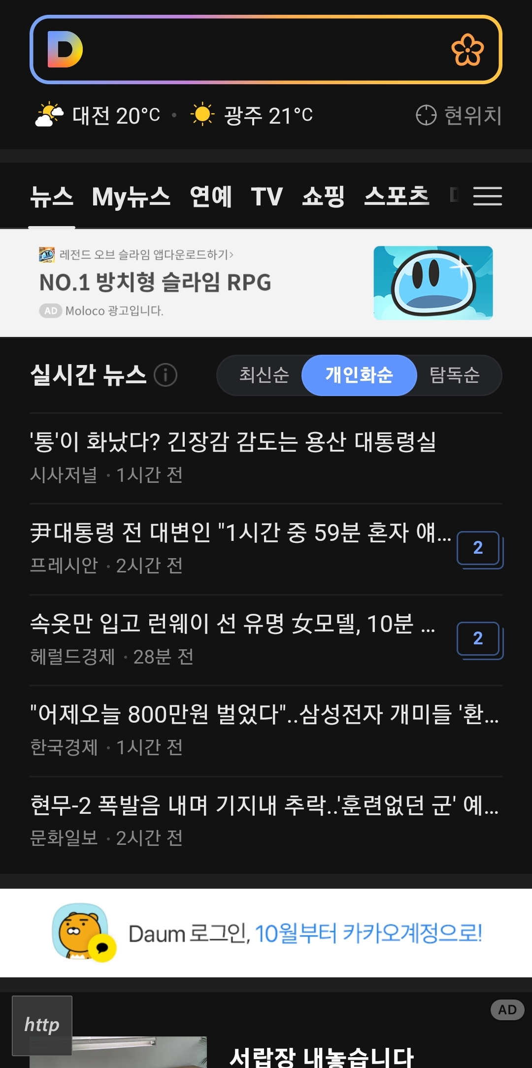 5. 그러면 앱 설정 창부터 바로 다크모드로 변하게 되며, 다음 메인 화면으로 돌아가 보더라도 이전과는 달리 검은 화면이 유지되고 있는 것을 확인할 수 있습니다. 그러나 사진이나 광고 같은 부분들의 색깔이 밝아서 눈이 더 아프게 느껴질 수도 있습니다.