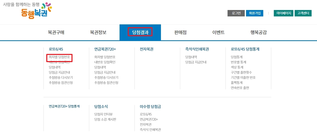 2. 홈페이지 상단 메뉴에서 당첨결과를 클릭한 후, 로또 6/45를 선택하고 회차별 당첨번호를 클릭하세요.
