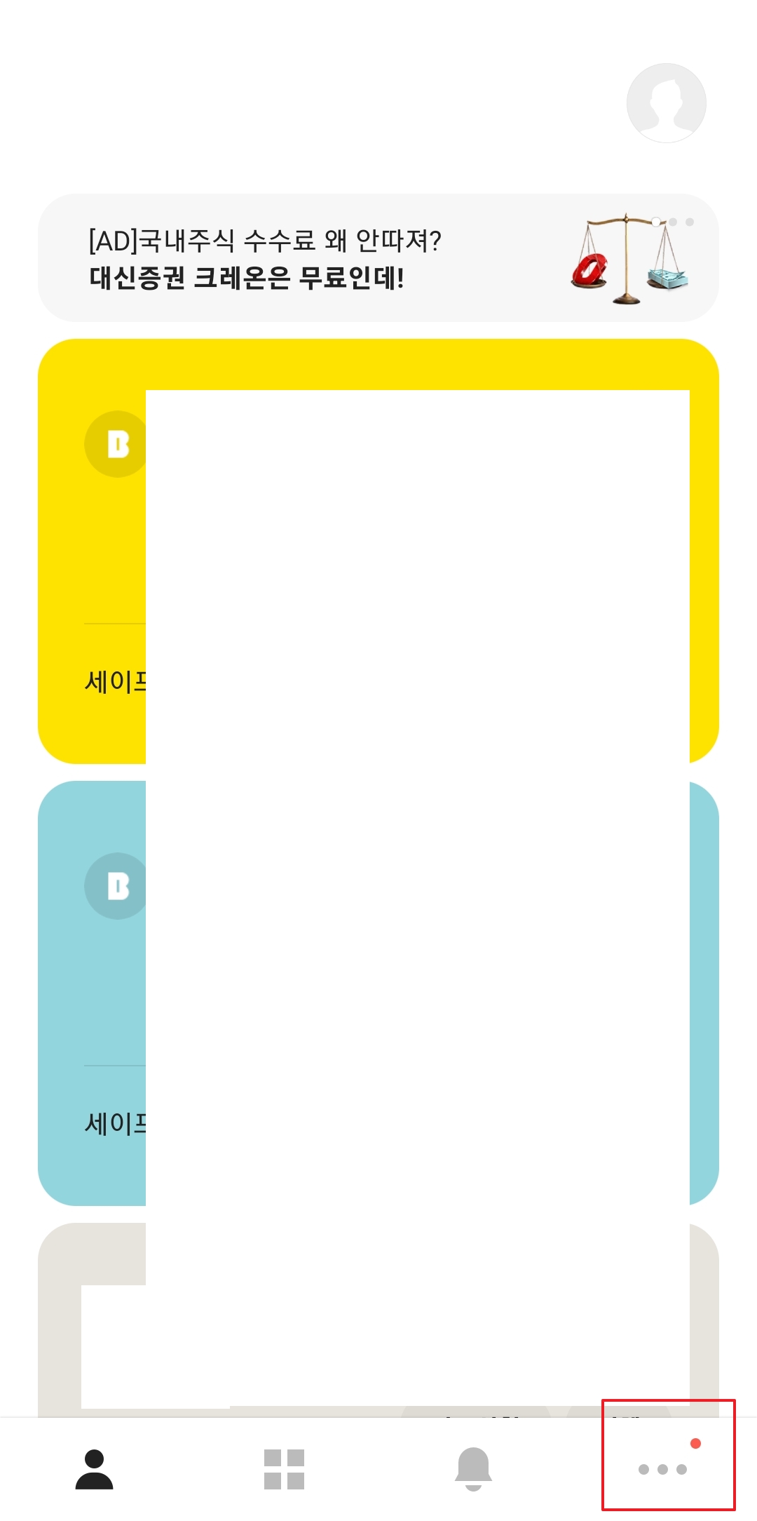 카카오뱅크 어플리케이션을 실행한 후 우측 하단에 위치한 점 세 개의 메뉴 버튼을 누르시면, 다양한 메뉴를 확인할 수 있어요.