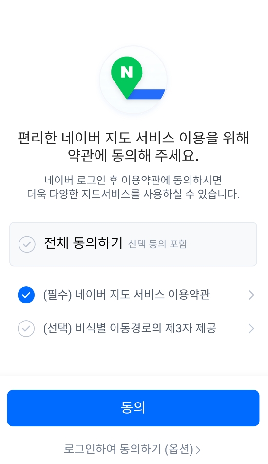 3. 네이버지도 앱 설치가 완료되면, 앱을 열어주세요. 처음 앱을 실행하면 사용자 약관에 동의해야 합니다. 필수 약관에 동의하는 것만으로 충분합니다.
