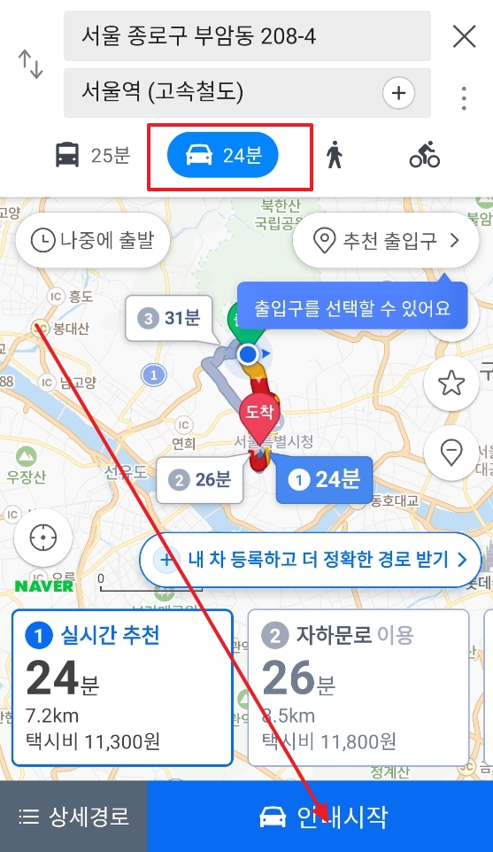 6. 내비게이션 모드에서는 상단의 검색창을 통해 목적지를 입력하고 도착 버튼을 클릭합니다. 이후 승용차 모양의 아이콘을 클릭하면, 화면 하단에 안내 시작 버튼이 나타납니다. 이 버튼을 클릭하면 실시간 길 안내가 시작됩니다.