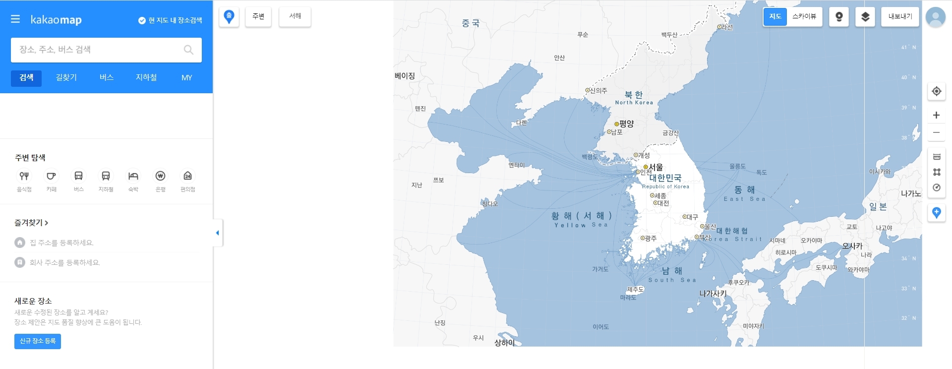 3. 그러나 카카오맵(다음 지도)은 한국만 자세하게 지원합니다. 일본과 중국도 일부 보이지만, 실제로 해당 지역을 확대하면 행정구역 구분선과 몇몇 글자만 표시됩니다.